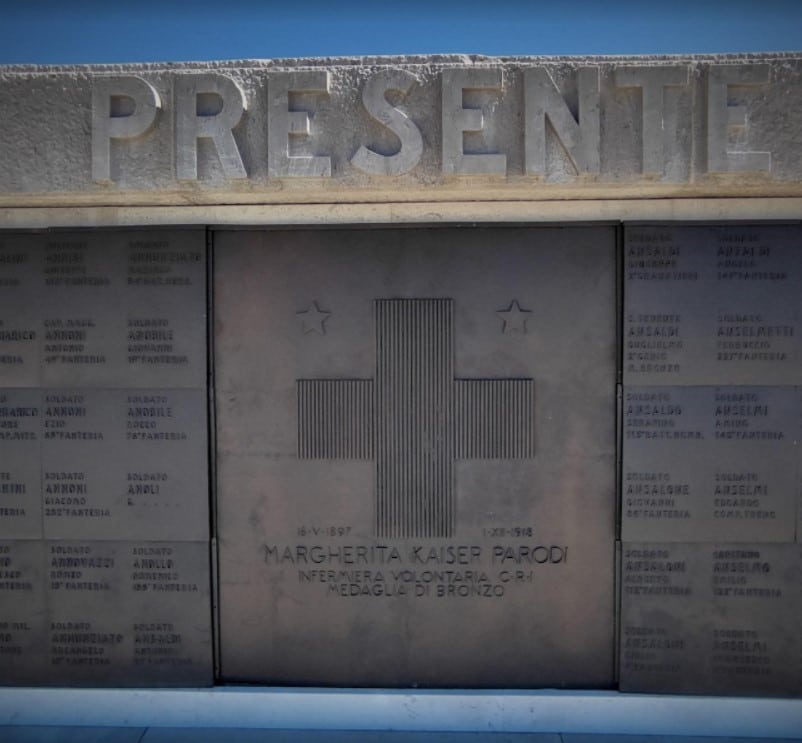 La visione di Giovanni Greppi andava oltre la semplice architettura monumentale; mirava a creare un’opera di profonda spiritualità. L’intera struttura rappresenta un esercito schierato che, guidato dai suoi comandanti, sembra marciare verso il cielo. Ogni lapide in bronzo, con la semplice dicitura “Presente”, trasforma il silenzio del luogo in un eterno appello a cui ogni soldato risponde. Quest’opera grandiosa fu anche l’evoluzione di uno spirito di pietà e cura nato dal sacrificio stesso. Ne è simbolo toccante la figura di Margherita Kaiser Parodi. Giovane infermiera volontaria della Croce Rossa, prestò servizio negli ospedali da campo a ridosso del fronte. Anche dopo la fine delle ostilità, scelse di continuare ad assistere i soldati malati, ma contrasse la virulenta influenza spagnola e si spense il 1° dicembre 1918. Per onorare il suo desiderio di riposare accanto ai soldati che aveva curato, la sua salma fu traslata a Redipuglia. La sua tomba, unica donna accolta nel sacrario, testimonia la dimensione di un sacrificio che andò oltre la guerra stessa.